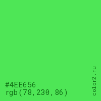Цвет #4EE656 в цветовой модели RGB обозначается тремя октетами (78, 230, 86) в десятичном формате и #4EE656 в шестнадцатиричном (hex) формате, которые являются интенсивностью красного 78 (hex 4E), интенсивность зелёного 230 (hex E6) и интенсивность синего 86 (hex 56).