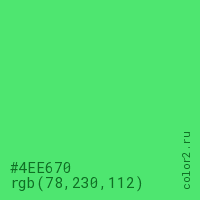 Цвет #4EE670 в цветовой модели RGB обозначается тремя октетами (78, 230, 112) в десятичном формате и #4EE670 в шестнадцатиричном (hex) формате, которые являются интенсивностью красного 78 (hex 4E), интенсивность зелёного 230 (hex E6) и интенсивность синего 112 (hex 70).