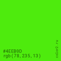 Цвет #4EEB0D в цветовой модели RGB обозначается тремя октетами (78, 235, 13) в десятичном формате и #4EEB0D в шестнадцатиричном (hex) формате, которые являются интенсивностью красного 78 (hex 4E), интенсивность зелёного 235 (hex EB) и интенсивность синего 13 (hex 0D).