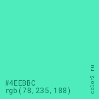 Цвет #4EEBBC в цветовой модели RGB обозначается тремя октетами (78, 235, 188) в десятичном формате и #4EEBBC в шестнадцатиричном (hex) формате, которые являются интенсивностью красного 78 (hex 4E), интенсивность зелёного 235 (hex EB) и интенсивность синего 188 (hex BC).