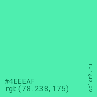 Цвет #4EEEAF в цветовой модели RGB обозначается тремя октетами (78, 238, 175) в десятичном формате и #4EEEAF в шестнадцатиричном (hex) формате, которые являются интенсивностью красного 78 (hex 4E), интенсивность зелёного 238 (hex EE) и интенсивность синего 175 (hex AF).
