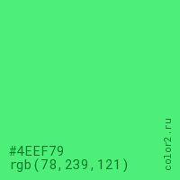 Цвет #4EEF79 в цветовой модели RGB обозначается тремя октетами (78, 239, 121) в десятичном формате и #4EEF79 в шестнадцатиричном (hex) формате, которые являются интенсивностью красного 78 (hex 4E), интенсивность зелёного 239 (hex EF) и интенсивность синего 121 (hex 79).