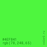 Цвет #4EF841 в цветовой модели RGB обозначается тремя октетами (78, 248, 65) в десятичном формате и #4EF841 в шестнадцатиричном (hex) формате, которые являются интенсивностью красного 78 (hex 4E), интенсивность зелёного 248 (hex F8) и интенсивность синего 65 (hex 41).
