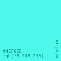 Цвет #4EF8EB в цветовой модели RGB обозначается тремя октетами (78, 248, 235) в десятичном формате и #4EF8EB в шестнадцатиричном (hex) формате, которые являются интенсивностью красного 78 (hex 4E), интенсивность зелёного 248 (hex F8) и интенсивность синего 235 (hex EB).