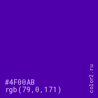 Цвет #4F00AB в цветовой модели RGB обозначается тремя октетами (79, 0, 171) в десятичном формате и #4F00AB в шестнадцатиричном (hex) формате, которые являются интенсивностью красного 79 (hex 4F), интенсивность зелёного 0 (hex 00) и интенсивность синего 171 (hex AB).