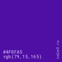 Цвет #4F0FA5 в цветовой модели RGB обозначается тремя октетами (79, 15, 165) в десятичном формате и #4F0FA5 в шестнадцатиричном (hex) формате, которые являются интенсивностью красного 79 (hex 4F), интенсивность зелёного 15 (hex 0F) и интенсивность синего 165 (hex A5).
