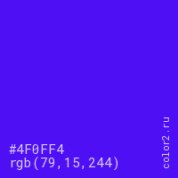 Цвет #4F0FF4 в цветовой модели RGB обозначается тремя октетами (79, 15, 244) в десятичном формате и #4F0FF4 в шестнадцатиричном (hex) формате, которые являются интенсивностью красного 79 (hex 4F), интенсивность зелёного 15 (hex 0F) и интенсивность синего 244 (hex F4).