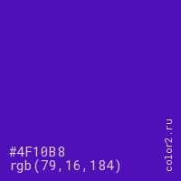 Цвет #4F10B8 в цветовой модели RGB обозначается тремя октетами (79, 16, 184) в десятичном формате и #4F10B8 в шестнадцатиричном (hex) формате, которые являются интенсивностью красного 79 (hex 4F), интенсивность зелёного 16 (hex 10) и интенсивность синего 184 (hex B8).