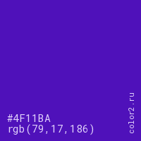 Цвет #4F11BA в цветовой модели RGB обозначается тремя октетами (79, 17, 186) в десятичном формате и #4F11BA в шестнадцатиричном (hex) формате, которые являются интенсивностью красного 79 (hex 4F), интенсивность зелёного 17 (hex 11) и интенсивность синего 186 (hex BA).