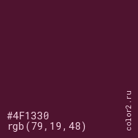 Цвет #4F1330 в цветовой модели RGB обозначается тремя октетами (79, 19, 48) в десятичном формате и #4F1330 в шестнадцатиричном (hex) формате, которые являются интенсивностью красного 79 (hex 4F), интенсивность зелёного 19 (hex 13) и интенсивность синего 48 (hex 30).