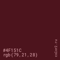 Цвет #4F151C в цветовой модели RGB обозначается тремя октетами (79, 21, 28) в десятичном формате и #4F151C в шестнадцатиричном (hex) формате, которые являются интенсивностью красного 79 (hex 4F), интенсивность зелёного 21 (hex 15) и интенсивность синего 28 (hex 1C).