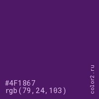 Цвет #4F1867 в цветовой модели RGB обозначается тремя октетами (79, 24, 103) в десятичном формате и #4F1867 в шестнадцатиричном (hex) формате, которые являются интенсивностью красного 79 (hex 4F), интенсивность зелёного 24 (hex 18) и интенсивность синего 103 (hex 67).