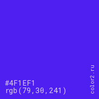 Цвет #4F1EF1 в цветовой модели RGB обозначается тремя октетами (79, 30, 241) в десятичном формате и #4F1EF1 в шестнадцатиричном (hex) формате, которые являются интенсивностью красного 79 (hex 4F), интенсивность зелёного 30 (hex 1E) и интенсивность синего 241 (hex F1).
