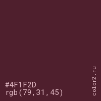 Цвет #4F1F2D в цветовой модели RGB обозначается тремя октетами (79, 31, 45) в десятичном формате и #4F1F2D в шестнадцатиричном (hex) формате, которые являются интенсивностью красного 79 (hex 4F), интенсивность зелёного 31 (hex 1F) и интенсивность синего 45 (hex 2D).