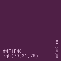 Цвет #4F1F46 в цветовой модели RGB обозначается тремя октетами (79, 31, 70) в десятичном формате и #4F1F46 в шестнадцатиричном (hex) формате, которые являются интенсивностью красного 79 (hex 4F), интенсивность зелёного 31 (hex 1F) и интенсивность синего 70 (hex 46).