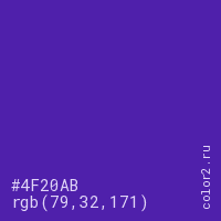 Цвет #4F20AB в цветовой модели RGB обозначается тремя октетами (79, 32, 171) в десятичном формате и #4F20AB в шестнадцатиричном (hex) формате, которые являются интенсивностью красного 79 (hex 4F), интенсивность зелёного 32 (hex 20) и интенсивность синего 171 (hex AB).