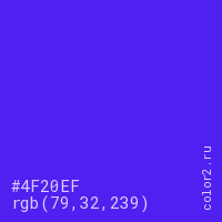 Цвет #4F20EF в цветовой модели RGB обозначается тремя октетами (79, 32, 239) в десятичном формате и #4F20EF в шестнадцатиричном (hex) формате, которые являются интенсивностью красного 79 (hex 4F), интенсивность зелёного 32 (hex 20) и интенсивность синего 239 (hex EF).