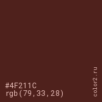 Цвет #4F211C в цветовой модели RGB обозначается тремя октетами (79, 33, 28) в десятичном формате и #4F211C в шестнадцатиричном (hex) формате, которые являются интенсивностью красного 79 (hex 4F), интенсивность зелёного 33 (hex 21) и интенсивность синего 28 (hex 1C).