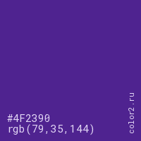 Цвет #4F2390 в цветовой модели RGB обозначается тремя октетами (79, 35, 144) в десятичном формате и #4F2390 в шестнадцатиричном (hex) формате, которые являются интенсивностью красного 79 (hex 4F), интенсивность зелёного 35 (hex 23) и интенсивность синего 144 (hex 90).