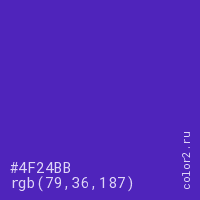 Цвет #4F24BB в цветовой модели RGB обозначается тремя октетами (79, 36, 187) в десятичном формате и #4F24BB в шестнадцатиричном (hex) формате, которые являются интенсивностью красного 79 (hex 4F), интенсивность зелёного 36 (hex 24) и интенсивность синего 187 (hex BB).