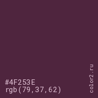 Цвет #4F253E в цветовой модели RGB обозначается тремя октетами (79, 37, 62) в десятичном формате и #4F253E в шестнадцатиричном (hex) формате, которые являются интенсивностью красного 79 (hex 4F), интенсивность зелёного 37 (hex 25) и интенсивность синего 62 (hex 3E).