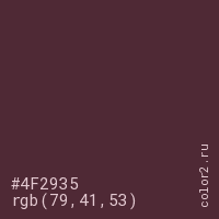 Цвет #4F2935 в цветовой модели RGB обозначается тремя октетами (79, 41, 53) в десятичном формате и #4F2935 в шестнадцатиричном (hex) формате, которые являются интенсивностью красного 79 (hex 4F), интенсивность зелёного 41 (hex 29) и интенсивность синего 53 (hex 35).
