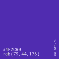 Цвет #4F2CB0 в цветовой модели RGB обозначается тремя октетами (79, 44, 176) в десятичном формате и #4F2CB0 в шестнадцатиричном (hex) формате, которые являются интенсивностью красного 79 (hex 4F), интенсивность зелёного 44 (hex 2C) и интенсивность синего 176 (hex B0).