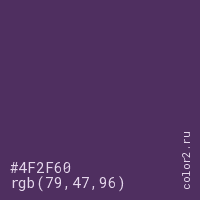 Цвет #4F2F60 в цветовой модели RGB обозначается тремя октетами (79, 47, 96) в десятичном формате и #4F2F60 в шестнадцатиричном (hex) формате, которые являются интенсивностью красного 79 (hex 4F), интенсивность зелёного 47 (hex 2F) и интенсивность синего 96 (hex 60).