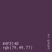 Цвет #4F314D в цветовой модели RGB обозначается тремя октетами (79, 49, 77) в десятичном формате и #4F314D в шестнадцатиричном (hex) формате, которые являются интенсивностью красного 79 (hex 4F), интенсивность зелёного 49 (hex 31) и интенсивность синего 77 (hex 4D).