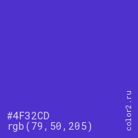 Цвет #4F32CD в цветовой модели RGB обозначается тремя октетами (79, 50, 205) в десятичном формате и #4F32CD в шестнадцатиричном (hex) формате, которые являются интенсивностью красного 79 (hex 4F), интенсивность зелёного 50 (hex 32) и интенсивность синего 205 (hex CD).