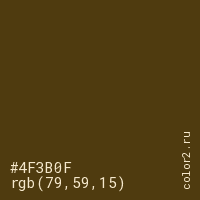 Цвет #4F3B0F в цветовой модели RGB обозначается тремя октетами (79, 59, 15) в десятичном формате и #4F3B0F в шестнадцатиричном (hex) формате, которые являются интенсивностью красного 79 (hex 4F), интенсивность зелёного 59 (hex 3B) и интенсивность синего 15 (hex 0F).