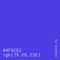 Цвет #4F3CE2 в цветовой модели RGB обозначается тремя октетами (79, 60, 226) в десятичном формате и #4F3CE2 в шестнадцатиричном (hex) формате, которые являются интенсивностью красного 79 (hex 4F), интенсивность зелёного 60 (hex 3C) и интенсивность синего 226 (hex E2).