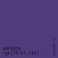 Цвет #4F3D7B в цветовой модели RGB обозначается тремя октетами (79, 61, 123) в десятичном формате и #4F3D7B в шестнадцатиричном (hex) формате, которые являются интенсивностью красного 79 (hex 4F), интенсивность зелёного 61 (hex 3D) и интенсивность синего 123 (hex 7B).
