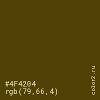 Цвет #4F4204 в цветовой модели RGB обозначается тремя октетами (79, 66, 4) в десятичном формате и #4F4204 в шестнадцатиричном (hex) формате, которые являются интенсивностью красного 79 (hex 4F), интенсивность зелёного 66 (hex 42) и интенсивность синего 4 (hex 04).