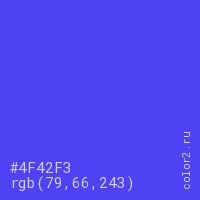 Цвет #4F42F3 в цветовой модели RGB обозначается тремя октетами (79, 66, 243) в десятичном формате и #4F42F3 в шестнадцатиричном (hex) формате, которые являются интенсивностью красного 79 (hex 4F), интенсивность зелёного 66 (hex 42) и интенсивность синего 243 (hex F3).