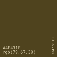 Цвет #4F431E в цветовой модели RGB обозначается тремя октетами (79, 67, 30) в десятичном формате и #4F431E в шестнадцатиричном (hex) формате, которые являются интенсивностью красного 79 (hex 4F), интенсивность зелёного 67 (hex 43) и интенсивность синего 30 (hex 1E).