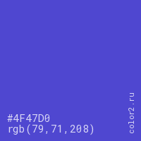 Цвет #4F47D0 в цветовой модели RGB обозначается тремя октетами (79, 71, 208) в десятичном формате и #4F47D0 в шестнадцатиричном (hex) формате, которые являются интенсивностью красного 79 (hex 4F), интенсивность зелёного 71 (hex 47) и интенсивность синего 208 (hex D0).