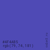 Цвет #4F4AB5 в цветовой модели RGB обозначается тремя октетами (79, 74, 181) в десятичном формате и #4F4AB5 в шестнадцатиричном (hex) формате, которые являются интенсивностью красного 79 (hex 4F), интенсивность зелёного 74 (hex 4A) и интенсивность синего 181 (hex B5).