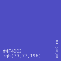 Цвет #4F4DC3 в цветовой модели RGB обозначается тремя октетами (79, 77, 195) в десятичном формате и #4F4DC3 в шестнадцатиричном (hex) формате, которые являются интенсивностью красного 79 (hex 4F), интенсивность зелёного 77 (hex 4D) и интенсивность синего 195 (hex C3).