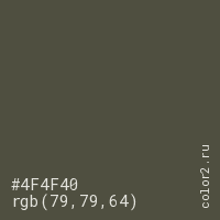 Цвет #4F4F40 в цветовой модели RGB обозначается тремя октетами (79, 79, 64) в десятичном формате и #4F4F40 в шестнадцатиричном (hex) формате, которые являются интенсивностью красного 79 (hex 4F), интенсивность зелёного 79 (hex 4F) и интенсивность синего 64 (hex 40).