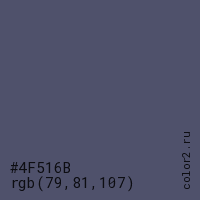 Цвет #4F516B в цветовой модели RGB обозначается тремя октетами (79, 81, 107) в десятичном формате и #4F516B в шестнадцатиричном (hex) формате, которые являются интенсивностью красного 79 (hex 4F), интенсивность зелёного 81 (hex 51) и интенсивность синего 107 (hex 6B).