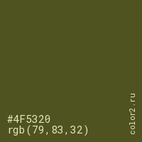 Цвет #4F5320 в цветовой модели RGB обозначается тремя октетами (79, 83, 32) в десятичном формате и #4F5320 в шестнадцатиричном (hex) формате, которые являются интенсивностью красного 79 (hex 4F), интенсивность зелёного 83 (hex 53) и интенсивность синего 32 (hex 20).