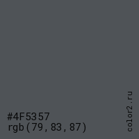 Цвет #4F5357 в цветовой модели RGB обозначается тремя октетами (79, 83, 87) в десятичном формате и #4F5357 в шестнадцатиричном (hex) формате, которые являются интенсивностью красного 79 (hex 4F), интенсивность зелёного 83 (hex 53) и интенсивность синего 87 (hex 57).
