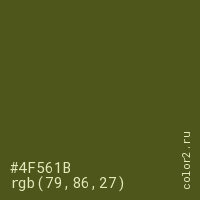 Цвет #4F561B в цветовой модели RGB обозначается тремя октетами (79, 86, 27) в десятичном формате и #4F561B в шестнадцатиричном (hex) формате, которые являются интенсивностью красного 79 (hex 4F), интенсивность зелёного 86 (hex 56) и интенсивность синего 27 (hex 1B).