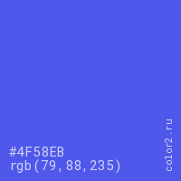 Цвет #4F58EB в цветовой модели RGB обозначается тремя октетами (79, 88, 235) в десятичном формате и #4F58EB в шестнадцатиричном (hex) формате, которые являются интенсивностью красного 79 (hex 4F), интенсивность зелёного 88 (hex 58) и интенсивность синего 235 (hex EB).