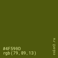 Цвет #4F590D в цветовой модели RGB обозначается тремя октетами (79, 89, 13) в десятичном формате и #4F590D в шестнадцатиричном (hex) формате, которые являются интенсивностью красного 79 (hex 4F), интенсивность зелёного 89 (hex 59) и интенсивность синего 13 (hex 0D).