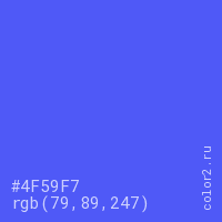 Цвет #4F59F7 в цветовой модели RGB обозначается тремя октетами (79, 89, 247) в десятичном формате и #4F59F7 в шестнадцатиричном (hex) формате, которые являются интенсивностью красного 79 (hex 4F), интенсивность зелёного 89 (hex 59) и интенсивность синего 247 (hex F7).