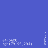 Цвет #4F5ACC в цветовой модели RGB обозначается тремя октетами (79, 90, 204) в десятичном формате и #4F5ACC в шестнадцатиричном (hex) формате, которые являются интенсивностью красного 79 (hex 4F), интенсивность зелёного 90 (hex 5A) и интенсивность синего 204 (hex CC).