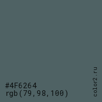 Цвет #4F6264 в цветовой модели RGB обозначается тремя октетами (79, 98, 100) в десятичном формате и #4F6264 в шестнадцатиричном (hex) формате, которые являются интенсивностью красного 79 (hex 4F), интенсивность зелёного 98 (hex 62) и интенсивность синего 100 (hex 64).