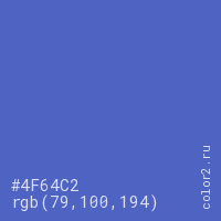 Цвет #4F64C2 в цветовой модели RGB обозначается тремя октетами (79, 100, 194) в десятичном формате и #4F64C2 в шестнадцатиричном (hex) формате, которые являются интенсивностью красного 79 (hex 4F), интенсивность зелёного 100 (hex 64) и интенсивность синего 194 (hex C2).
